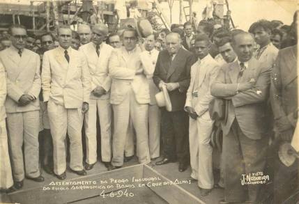 Lançamento da pedra fundamental da Escola Agronômica da Bahia, 1940. Landulfo Alves é o segundo a partir da esquerda, com a mão no bolso.